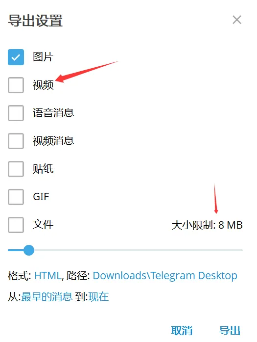 - 设置时间范围,可选择最近一个月或全部历史,注意单文件体积限制,视频总量过大可分批导出。